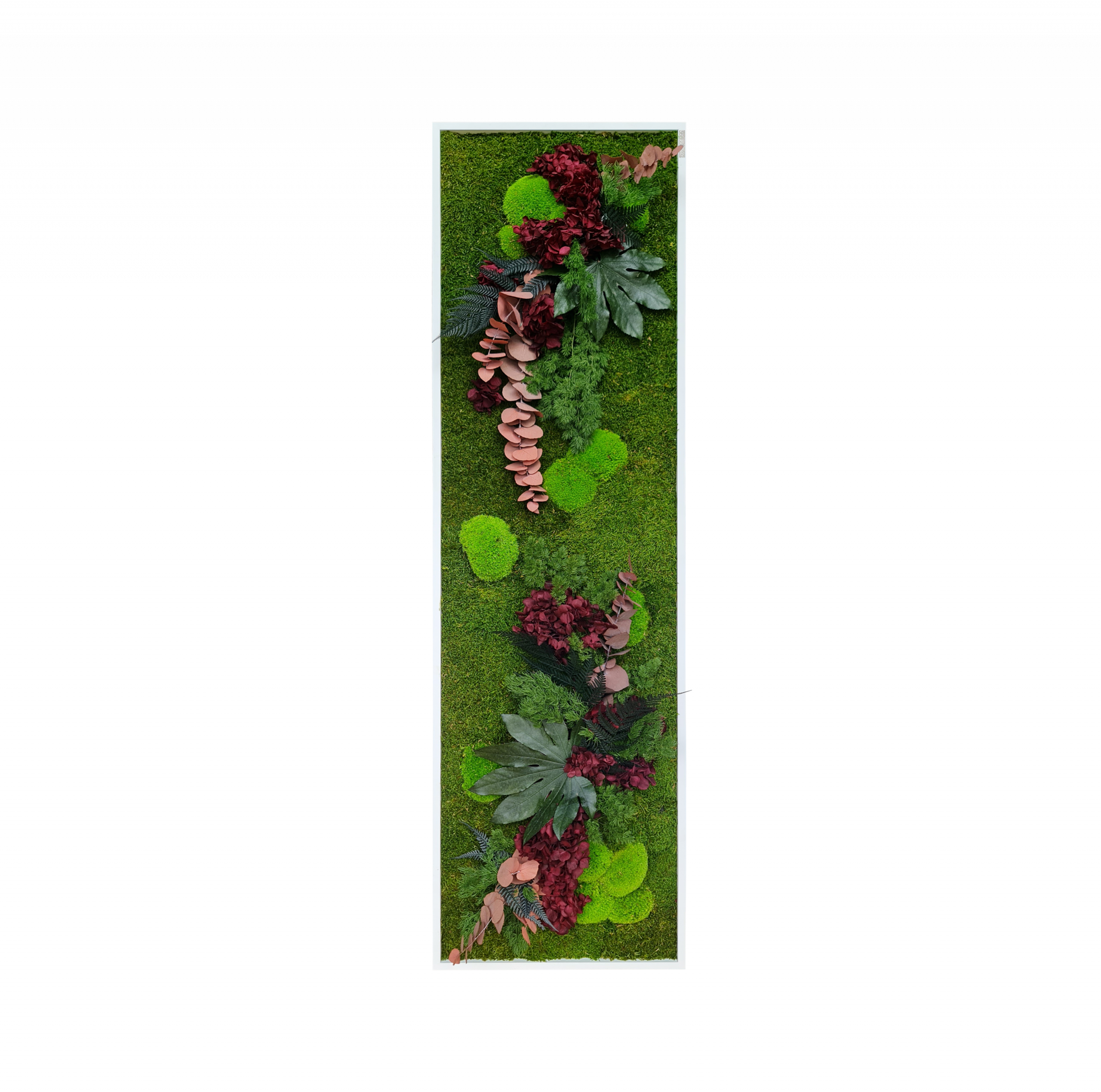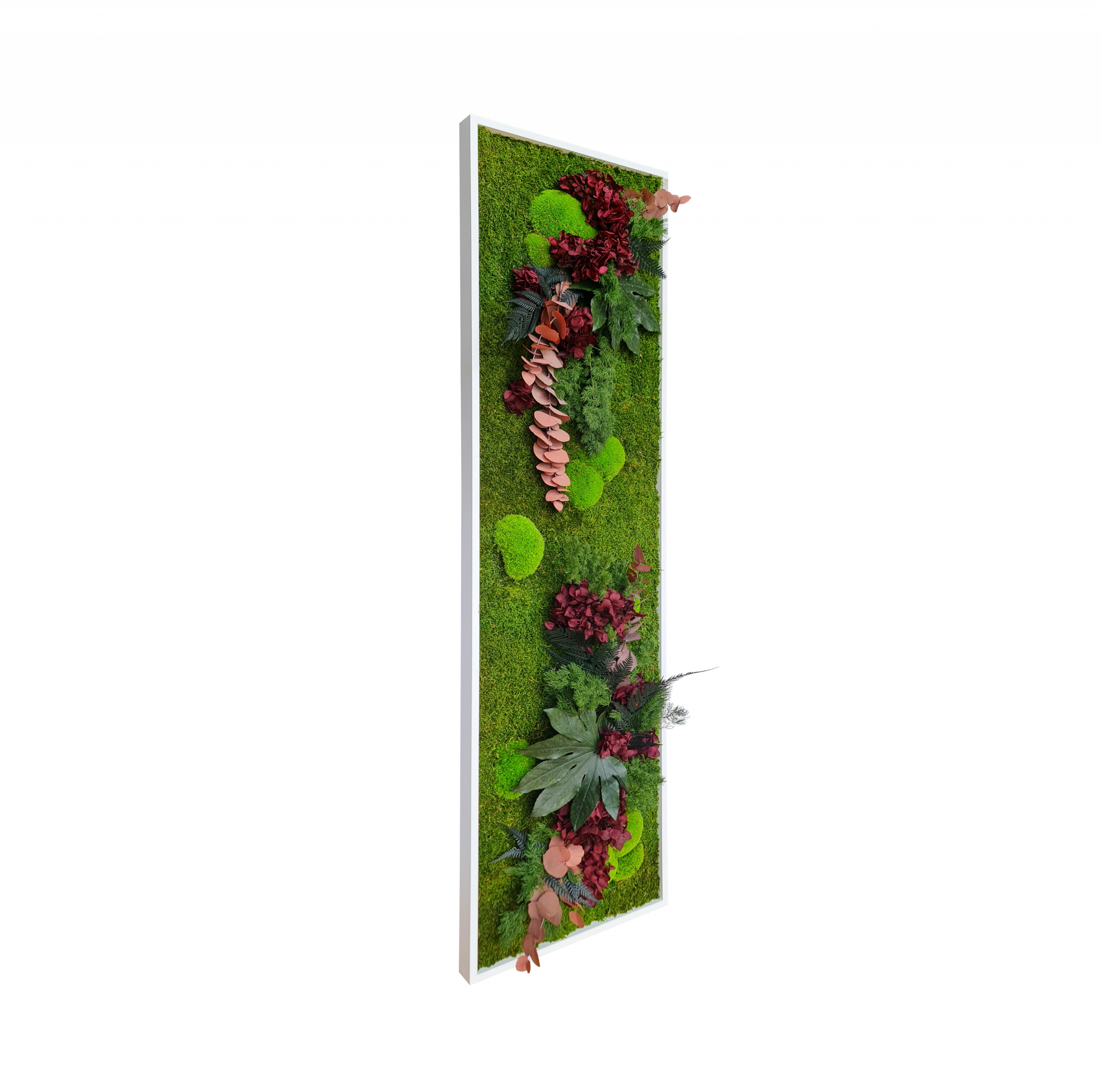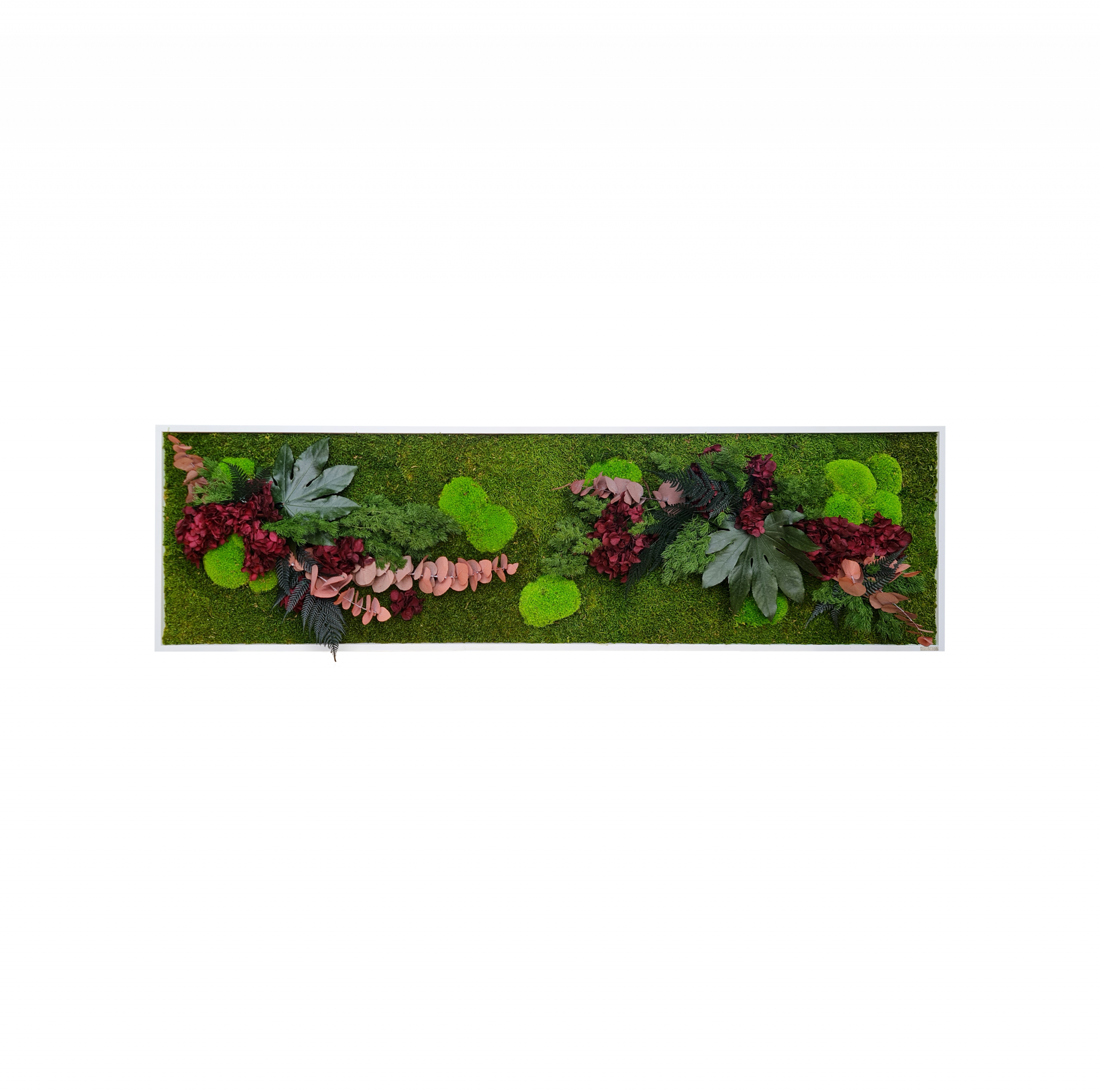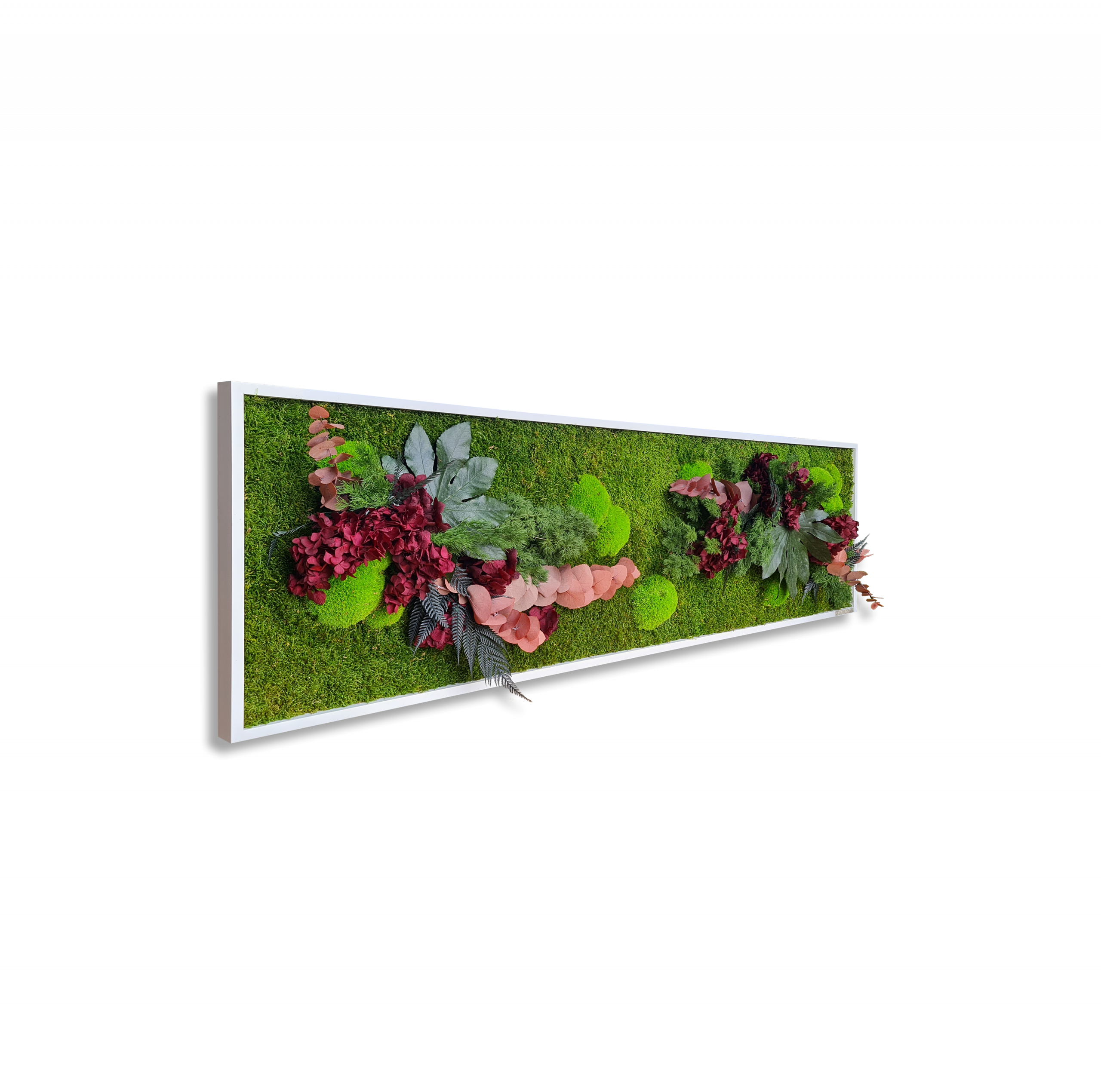 Das Pflanzenbild im Dschungeldesign mit roten Highlightpflanzen ist ein Blickfang für jede Räumlichkeit. Im Wohnzimmer über dem Sofa oder als Wanddekoration im Schlafzimmer bietet sich das Moosbild mit den Maßen 140×40 cm besonders an. Bringen Sie ein Stück Natur in ihre Räume. Eine wunderschöne Insel aus konservierten echten Pflanzen und Moosen schafft eine besondere Atmosphäre und wirkt beruhigend und entspannend.