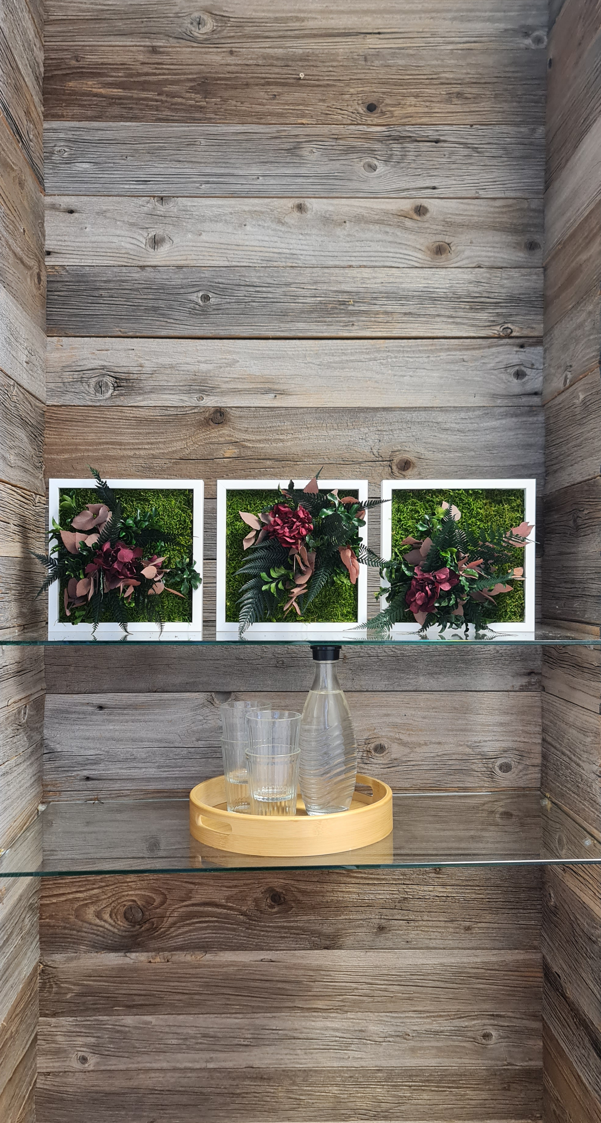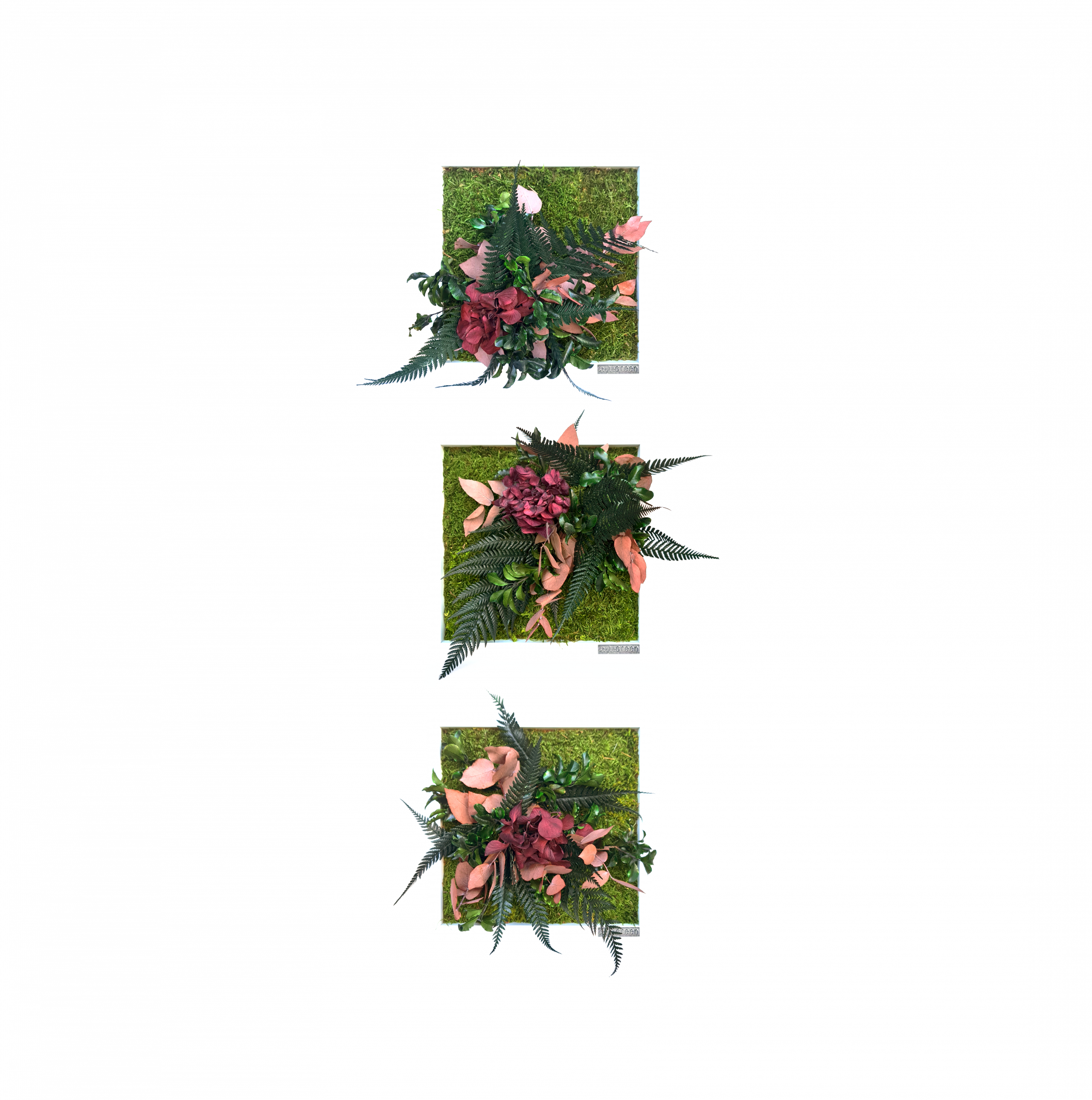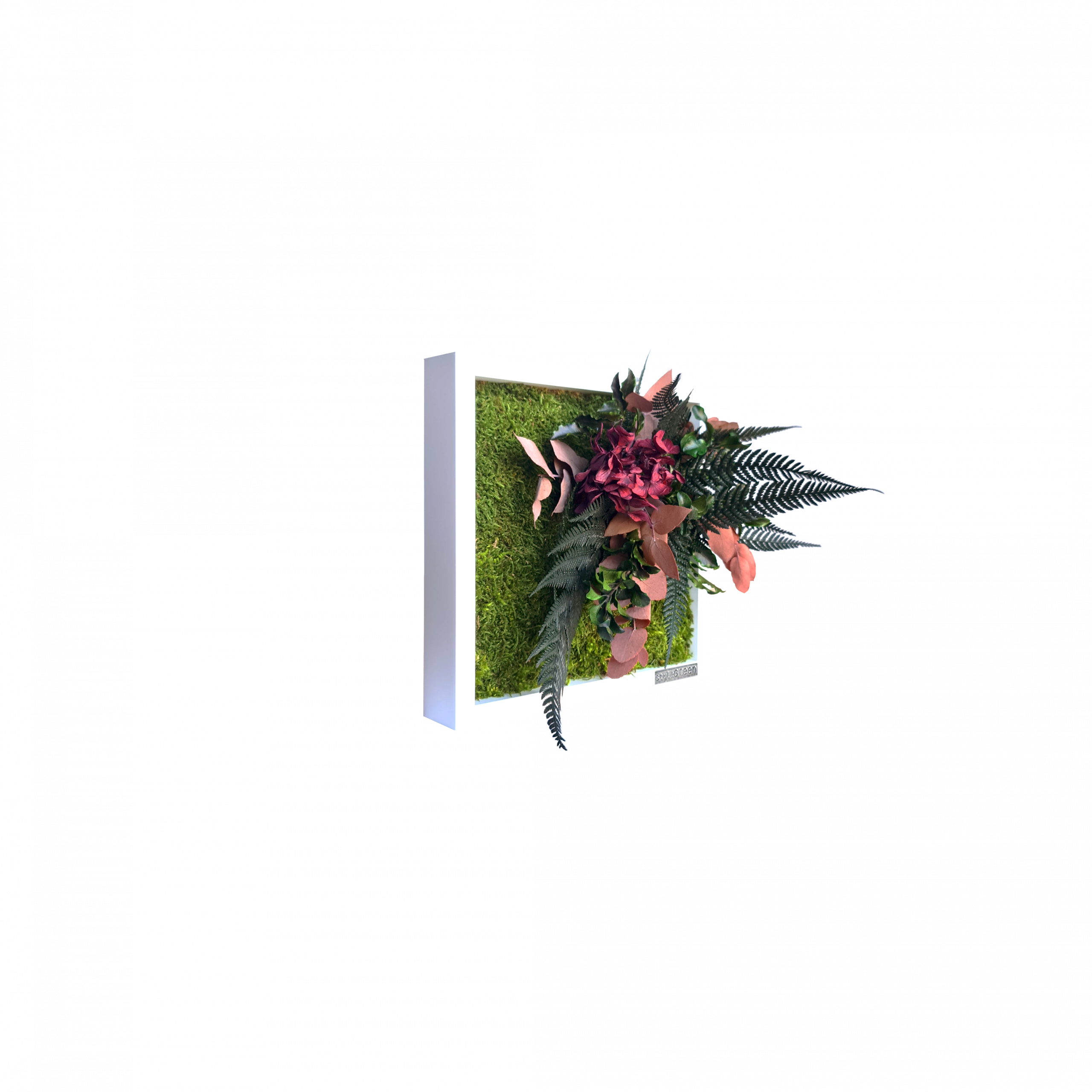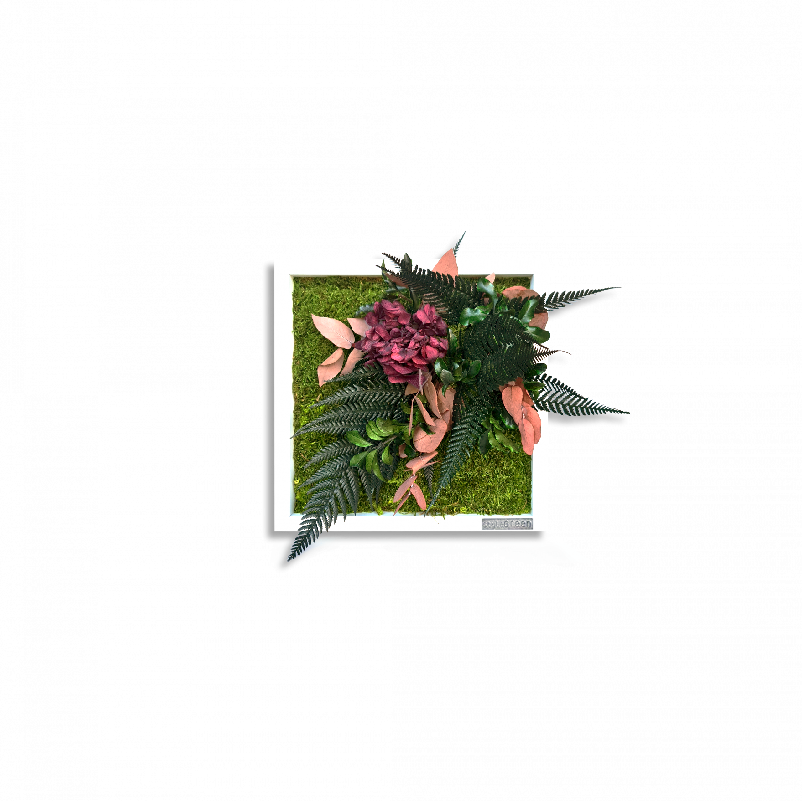 Unser kleinstes quadratisches Pflanzenbild mit einem Arrangement aus verschiedenen Pflanzen und flachem Waldmoos eignet sich hervorragend für kleine Räume wie Gäste WCs oder Hausflure. Da alle unsere Objekte weder Licht noch Wasser benötigen, fühlen sie sich in diesen Räumen sehr wohl.