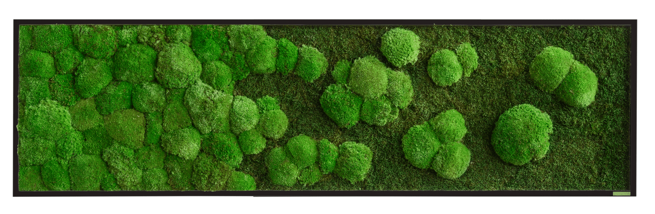 Die sanfte Kugelmoos-Landschaft geht langsam in eine dunklere Waldmoosfläche über. Diese besondere Komposition ist für jeden Raum ein besonderes Highlight und bringt so ein Stück pflegefreier Natur in Ihren Alltag.